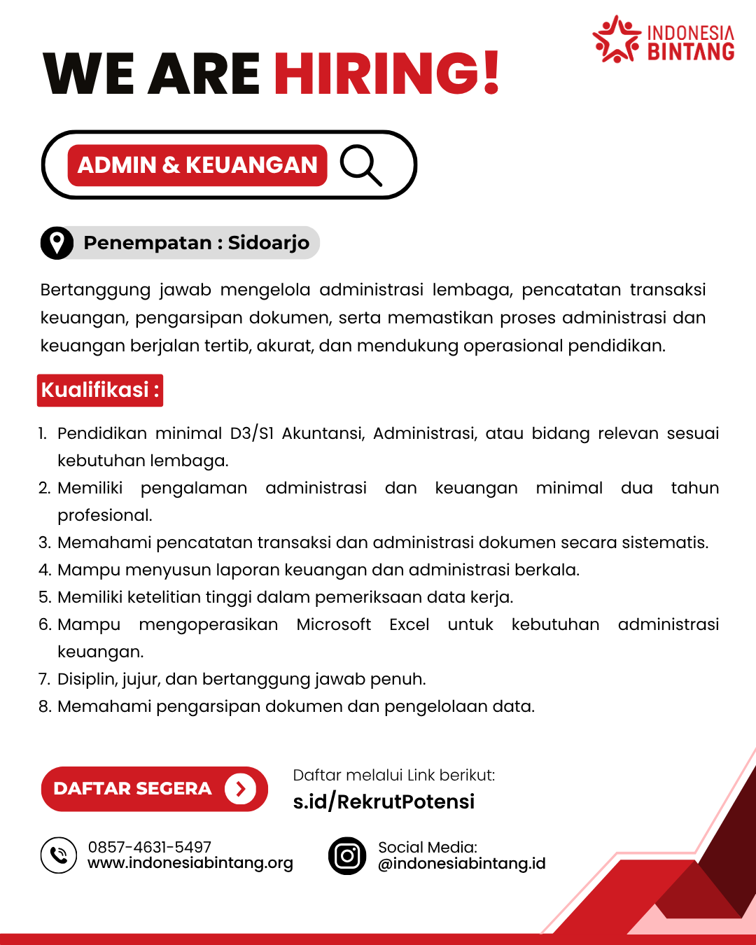 1. Pendidikan minimal D3/S1 Akuntansi, Administrasi, atau bidang relevan sesuai kebutuhan lembaga.