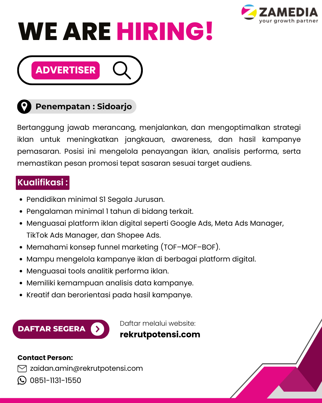 Bertanggung jawab merancang, menjalankan, dan mengoptimalkan strategi iklan untuk meningkatkan jangkauan, awareness, dan hasil kampanye pemasaran. Posisi ini mengelola penayangan iklan, analisis performa, serta memastikan pesan promosi tepat sasaran sesuai target audiens.