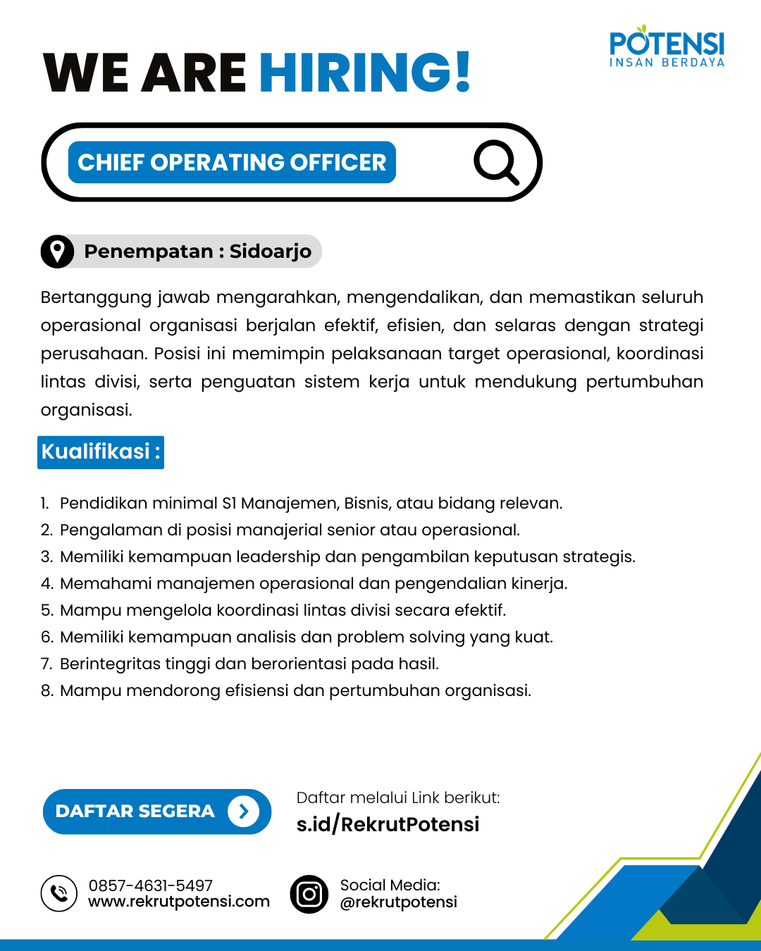 Bertanggung jawab mengarahkan, mengendalikan, dan memastikan seluruh operasional organisasi berjalan efektif, efisien, dan selaras dengan strategi perusahaan. Posisi ini memimpin pelaksanaan target operasional, koordinasi lintas divisi, serta penguatan sistem kerja untuk mendukung pertumbuhan organisasi.