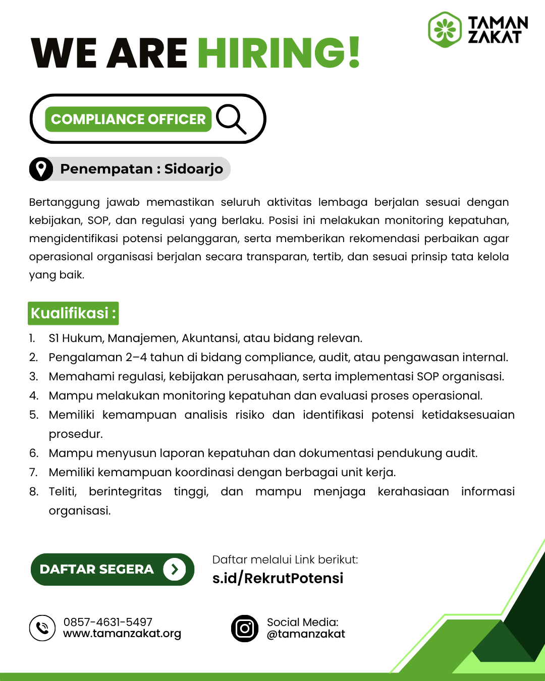 ertanggung jawab memastikan seluruh aktivitas lembaga berjalan sesuai dengan kebijakan, SOP, dan regulasi yang berlaku. Posisi ini melakukan monitoring kepatuhan, mengidentifikasi potensi pelanggaran, serta memberikan rekomendasi perbaikan agar operasional organisasi berjalan secara transparan, tertib, dan sesuai prinsip tata kelola yang baik.