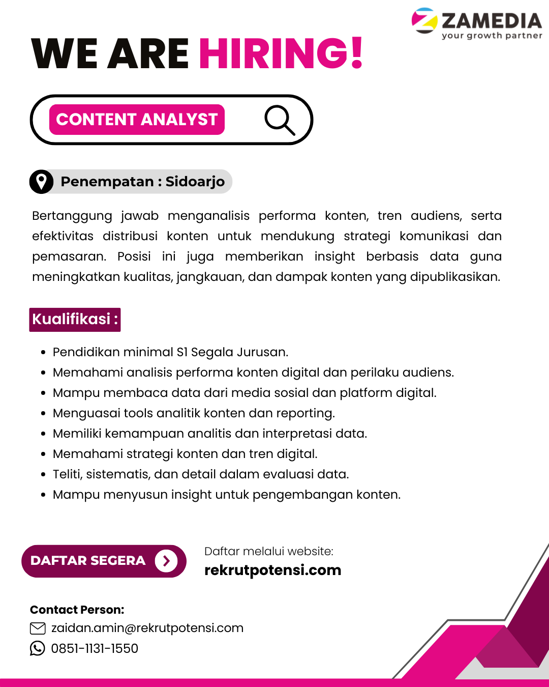 Bertanggung jawab menganalisis performa konten, tren audiens, serta efektivitas distribusi konten untuk mendukung strategi komunikasi dan pemasaran. Posisi ini juga memberikan insight berbasis data guna meningkatkan kualitas, jangkauan, dan dampak konten yang dipublikasikan.