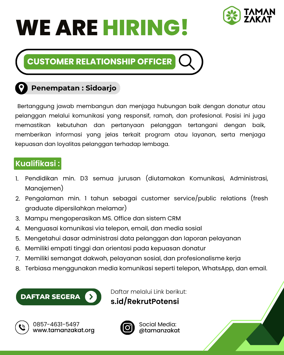Bertanggung jawab membangun dan menjaga hubungan baik dengan donatur atau pelanggan melalui komunikasi yang responsif, ramah, dan profesional. Posisi ini juga memastikan kebutuhan dan pertanyaan pelanggan tertangani dengan baik, memberikan informasi yang jelas terkait program atau layanan, serta menjaga kepuasan dan loyalitas pelanggan terhadap lembaga.
