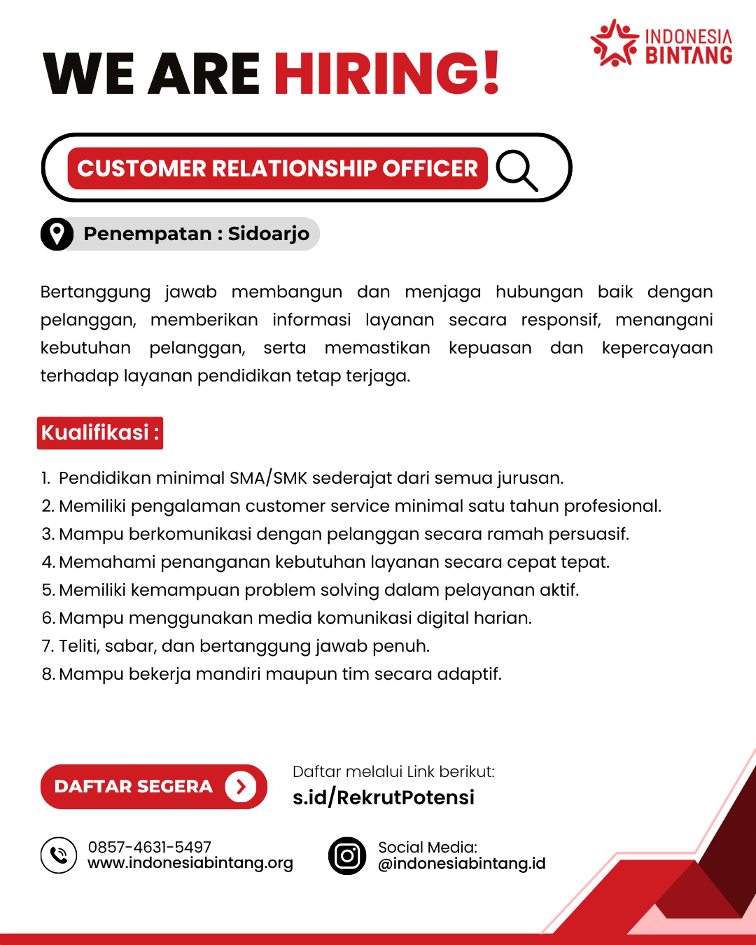 Bertanggung jawab membangun dan menjaga hubungan baik dengan pelanggan, memberikan informasi layanan secara responsif, menangani kebutuhan pelanggan, serta memastikan kepuasan dan kepercayaan terhadap layanan pendidikan tetap terjaga.