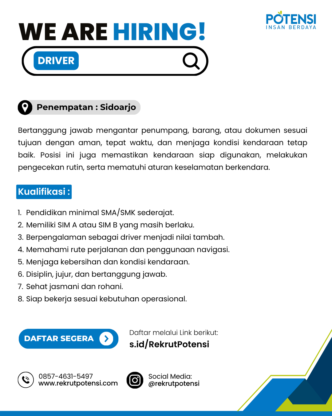 Bertanggung jawab mengantar penumpang, barang, atau dokumen sesuai tujuan dengan aman, tepat waktu, dan menjaga kondisi kendaraan tetap baik. Posisi ini juga memastikan kendaraan siap digunakan, melakukan pengecekan rutin, serta mematuhi aturan keselamatan berkendara.