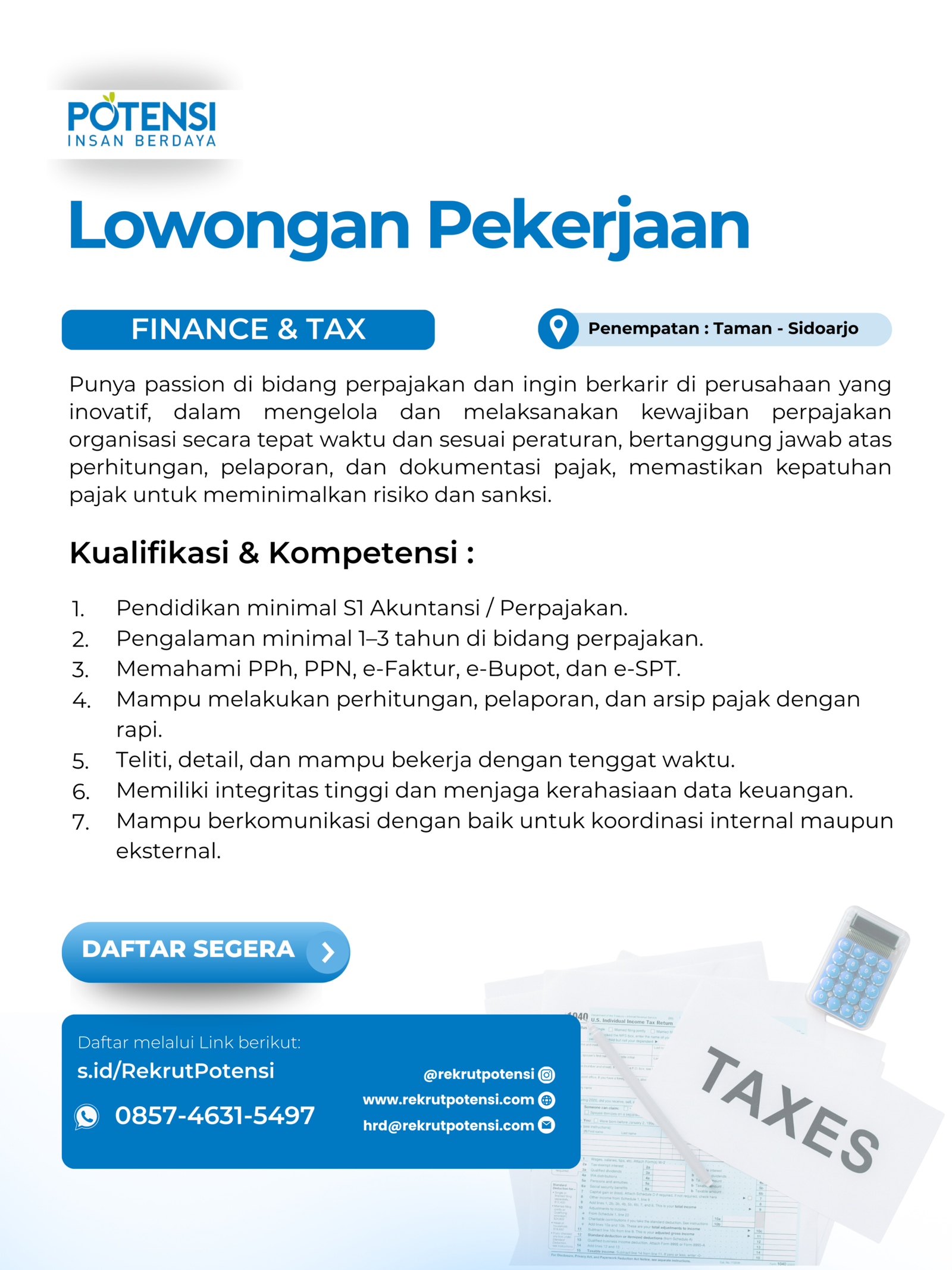 Punya passion di bidang perpajakan dan ingin berkarir di perusahaan yang inovatif, dalam mengelola dan melaksanakan kewajiban perpajakan organisasi secara tepat waktu dan sesuai peraturan, bertanggung jawab atas perhitungan, pelaporan, dan dokumentasi pajak, memastikan kepatuhan pajak untuk meminimalkan risiko dan sanksi.