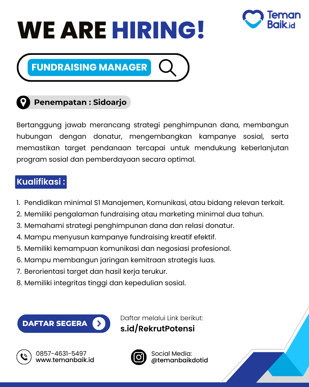 Bertanggung jawab merancang strategi penghimpunan dana, membangun hubungan dengan donatur, mengembangkan kampanye sosial, serta memastikan target pendanaan tercapai untuk mendukung keberlanjutan program sosial dan pemberdayaan secara optimal.