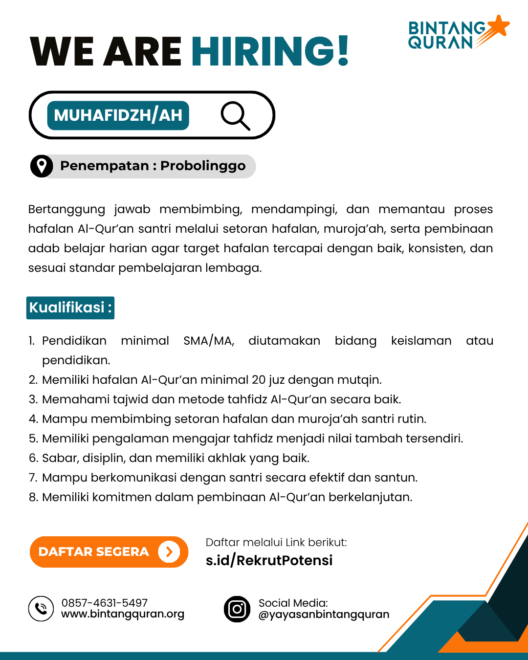 Bertanggung jawab membimbing, mendampingi, dan memantau proses hafalan Al-Qur’an santri melalui setoran hafalan, muroja’ah, serta pembinaan adab belajar harian agar target hafalan tercapai dengan baik, konsisten, dan sesuai standar pembelajaran lembaga.
