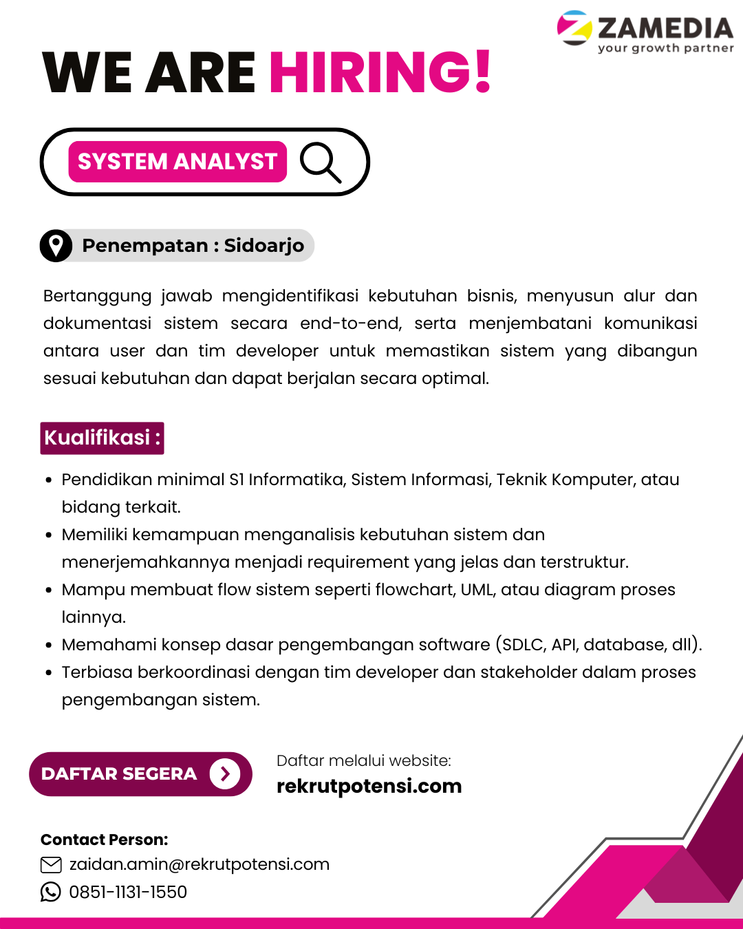 Bertanggung jawab mengidentifikasi kebutuhan bisnis, menyusun alur dan dokumentasi sistem secara end-to-end, serta menjembatani komunikasi antara user dan tim developer untuk memastikan sistem yang dibangun sesuai kebutuhan dan dapat berjalan secara optimal.