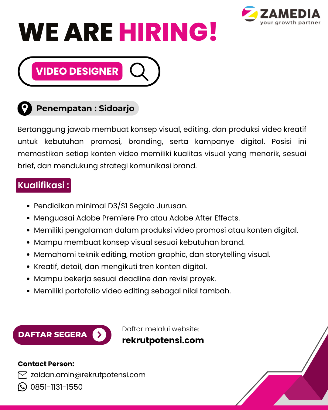 Bertanggung jawab membuat konsep visual, editing, dan produksi video kreatif untuk kebutuhan promosi, branding, serta kampanye digital. Posisi ini memastikan setiap konten video memiliki kualitas visual yang menarik, sesuai brief, dan mendukung strategi komunikasi brand.