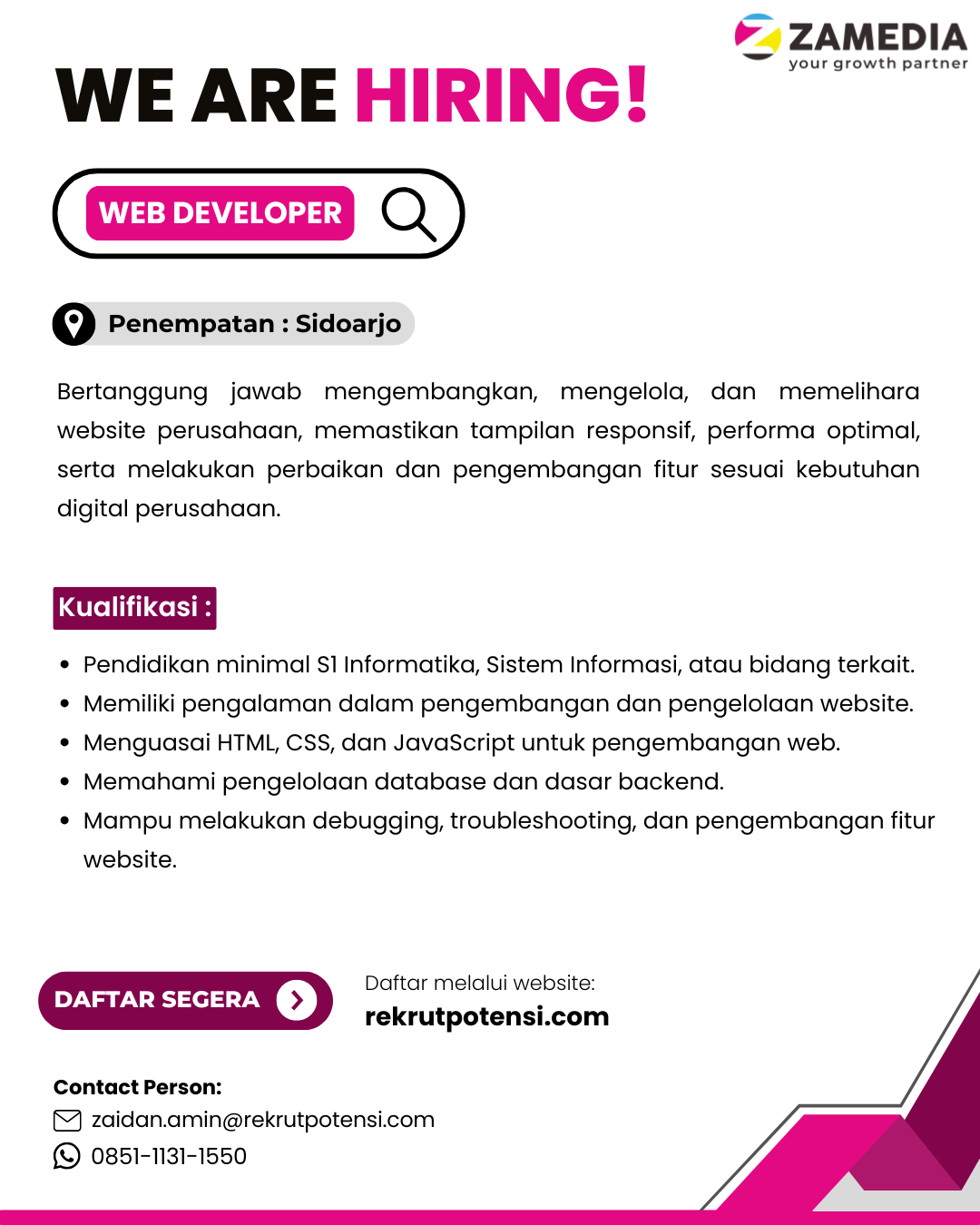 Bertanggung jawab mengembangkan, mengelola, dan memelihara website perusahaan, memastikan tampilan responsif, performa optimal, serta melakukan perbaikan dan pengembangan fitur sesuai kebutuhan digital perusahaan.